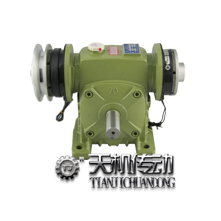 減速機(jī)電磁離合剎車器,臥式減速機(jī)電磁離合剎車器中心距(型號(hào))50#~100#,傳動(dòng)比i=10~60。輸出軸朝上,輸入兩端分別裝置DC24V干式單板電磁離合器(附雙槽皮帶輪、單槽皮帶輪等)、干式單板電磁剎車器,電磁離合器一端與驅(qū)動(dòng)三相異步電機(jī)(伺服、直流)連接。