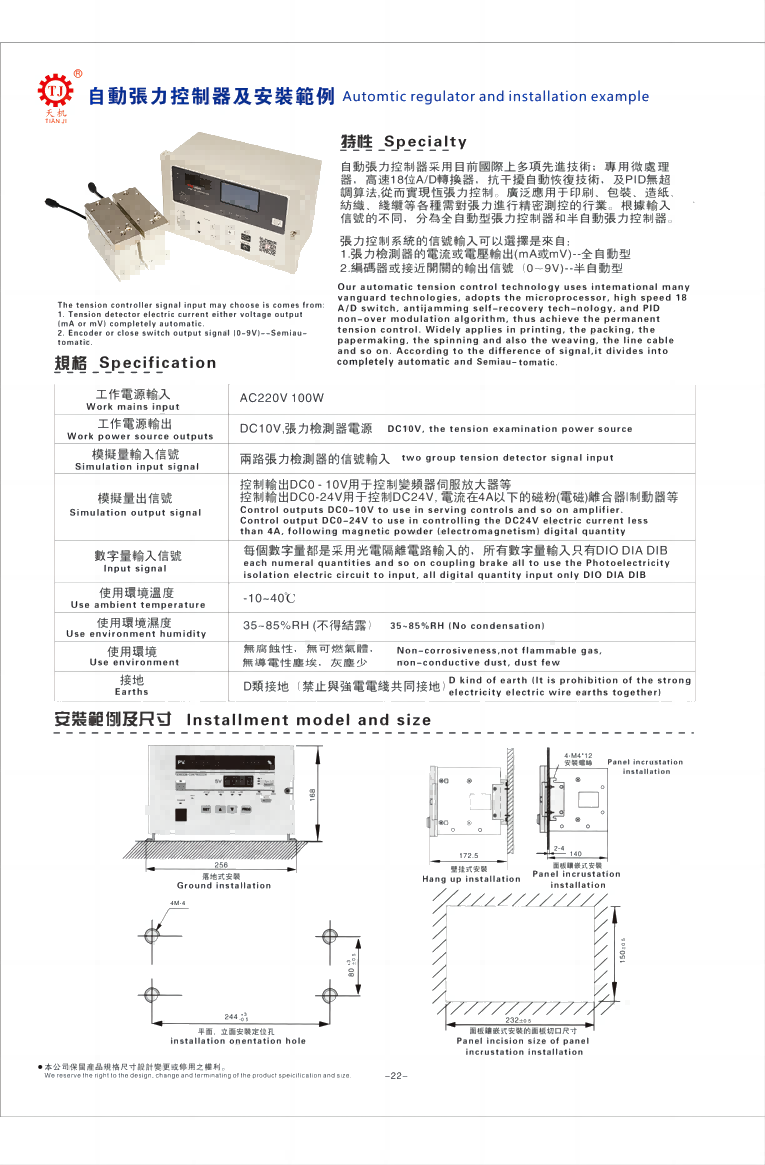 磁粉手動張力控制器,收卷放卷手動張力控制器一般應(yīng)用于長尺寸材料的收卷、放卷、張力控制系統(tǒng)。在卷徑變化較小的放卷、收卷控制或者中間軸控制時,進(jìn)行了使用磁粉制動器、磁粉離合器的手動控制(轉(zhuǎn)矩)。在機(jī)械停止時執(zhí)行緊急控制,或在運轉(zhuǎn)過程中進(jìn)行調(diào)節(jié)旋鈕運程操作。手動張力控制器是依據(jù)收料或者出料卷徑的變化,而分階段調(diào)整磁粉離合器與磁粉制動器的激磁電流表,從而獲得一致的張力,達(dá)到恒定。同類產(chǎn)品還有全自動張力控制器,該型張力控制器在技術(shù)上是比較先進(jìn),可省時間、省人工。由于使用了張力檢測器的閉環(huán)式張力控制器,根據(jù)外部順控程序進(jìn)行多軸切換控制時基于輥筒切換輸入信號執(zhí)行控制輸出的新軸預(yù)置控制,此類型張力控制器必須在外部執(zhí)行預(yù)驅(qū)動控制。手動張力控制器安裝方式有落地式安裝、壁掛式安裝、面板鑲嵌式安裝三種常見的。